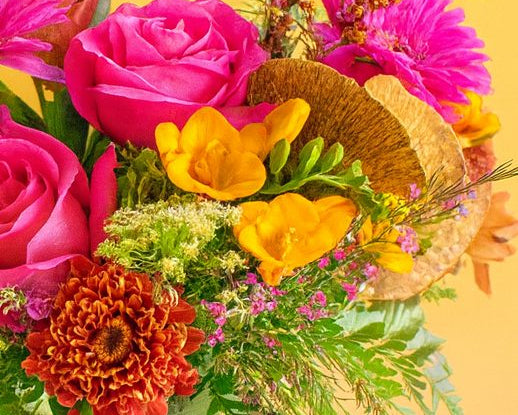This warm, cheerful design features a vibrant mix of premium hot pink roses, sunny yellow freesias, and textural autumnal blooms. It’s an ideal way to send a thoughtful Thank You Flower Arrangement or a charming gift "just because."